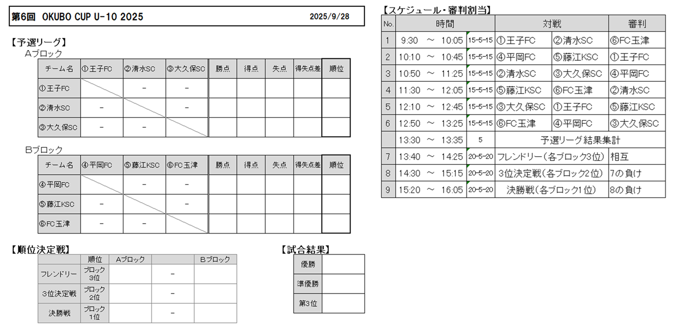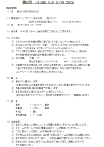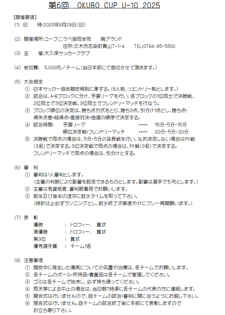 大久保カップのお知らせ(9/28(日):U12) 2025年9月26日 【日時】9月28日(日) 【場所】 コープこうべ協同学苑(三木) 【集合時間(清水小)】 U-10.12選手・指導者 7:50 お弁当 要 【要綱】 【組合せ&タイムスケジュール】 【会場図】 以上