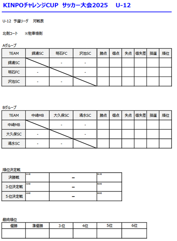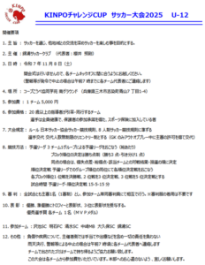 KINPOチャレンジカップのお知らせ(11/8(土):U12) 2025年10月27日 【日時】11月8日(土) 【場所】 コープこうべ協同学苑 南グランド 【集合時間(清水小)】 選手・指導者 AM10:00 お弁当 有り 【要綱】 【リーグ表】 【タイムスケジュール&会場図】 以上