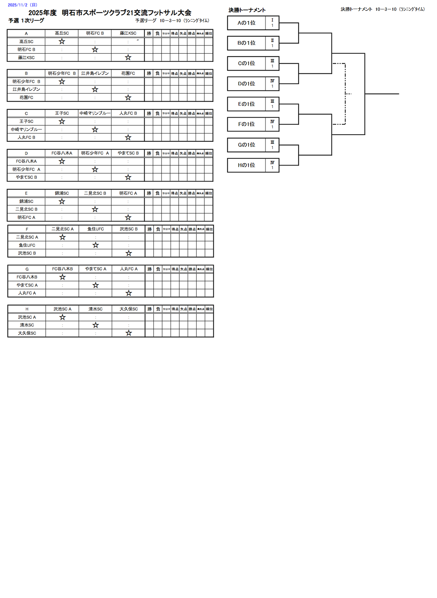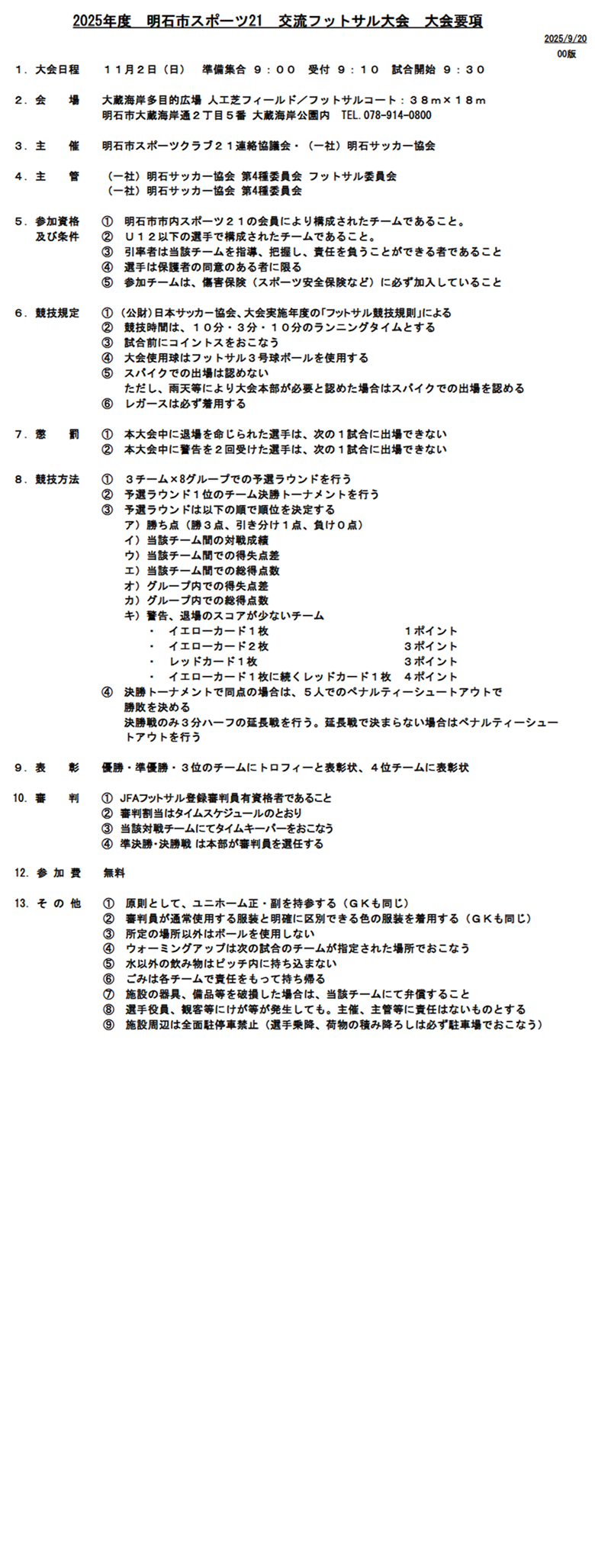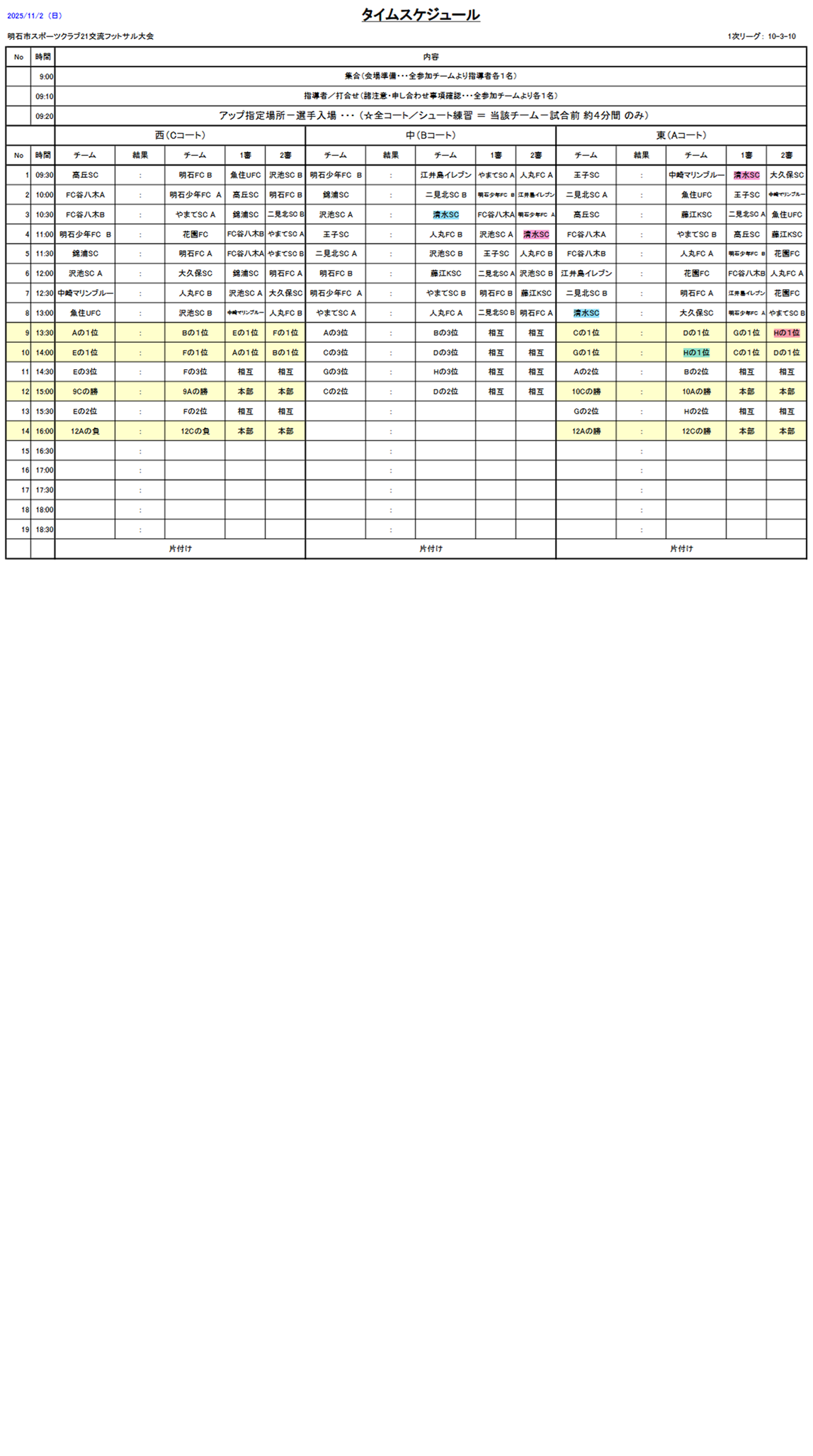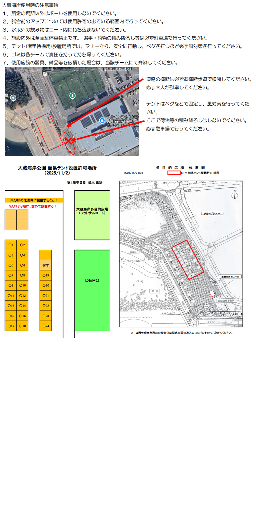 SC21フットサル大会のお知らせ(11/2(日):U12) 2025年10月27日 【日時】11月2日(日) 【場所】 大蔵海岸 【集合時間(清水小)】 選手・引率者 AM8:40 指導者(会場設営)AM9:00(第1試合審判9:30) お弁当 有り 【要綱】 【リーグ表&トーナメント表】 【タイムスケジュール】 【テント位置&注意事項】 以上