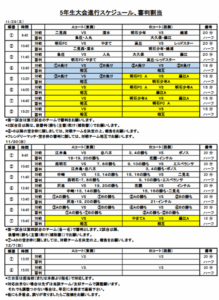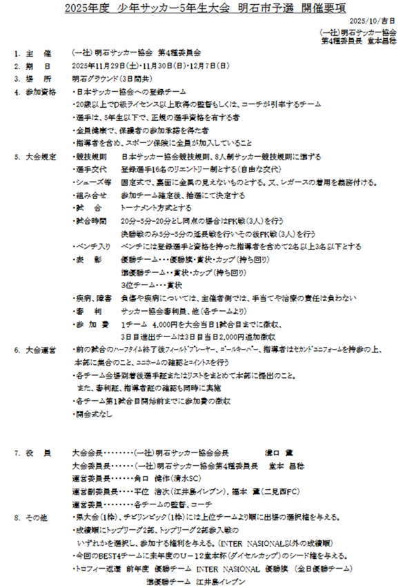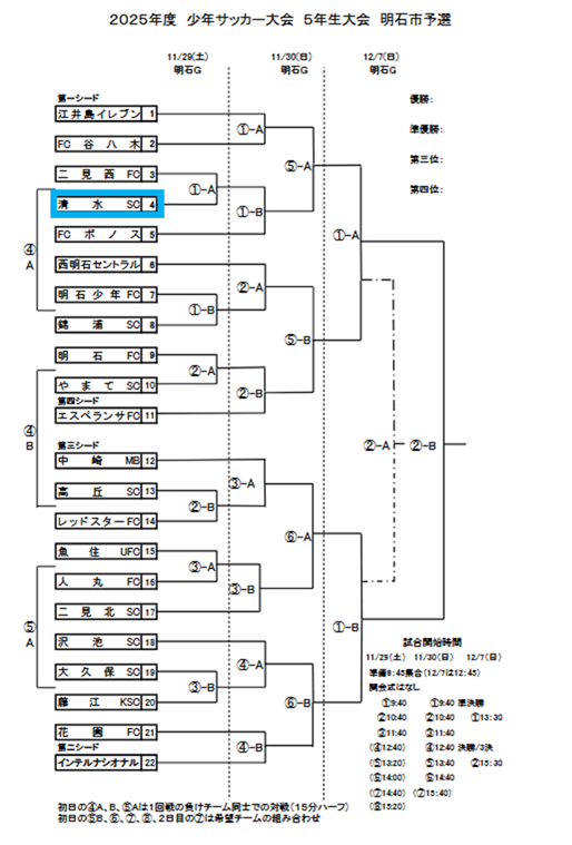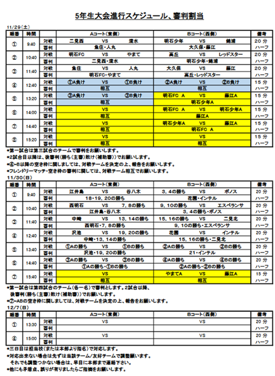 5年生大会のお知らせ(11/29(土) 30(日) 12/7(日):U11) 2025年11月17日 【日時】11月29日(土)・11月30日(日)・12月7日(日) 【場所】明石グラウンド 【集合時間(清水小)】 ☆11月29日(土)・選手8:10 準備集合8:45 お弁当・今のところ不要ですが、 空き枠利用できれば必要となりますので、 その際は監督からお知らせいたします。 【試合要綱】 【トーナメント表】 【タイムスケジュール】 以上