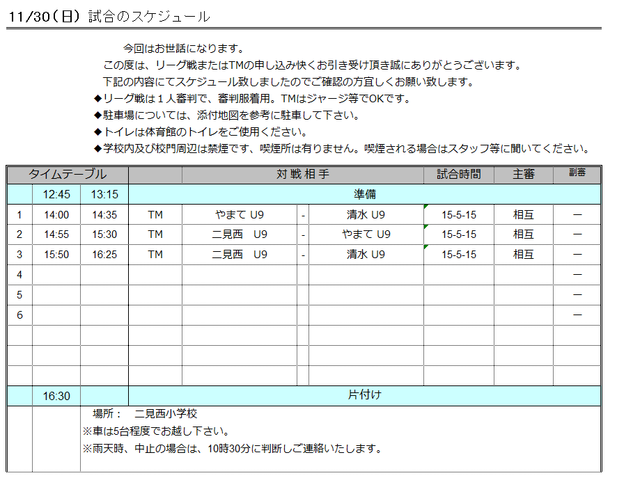 トレーニングマッチU9のお知らせ(11/30(日):U9) 2025年11月18日 【日時】11月30日(日) 【場所】二見西小学校 【集合】 午前中に軽めに練習して 11:00頃からお弁当を食べて 12:30出発予定。 【試合予定】 以上