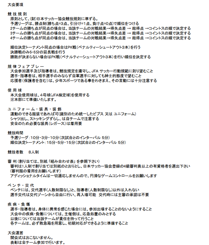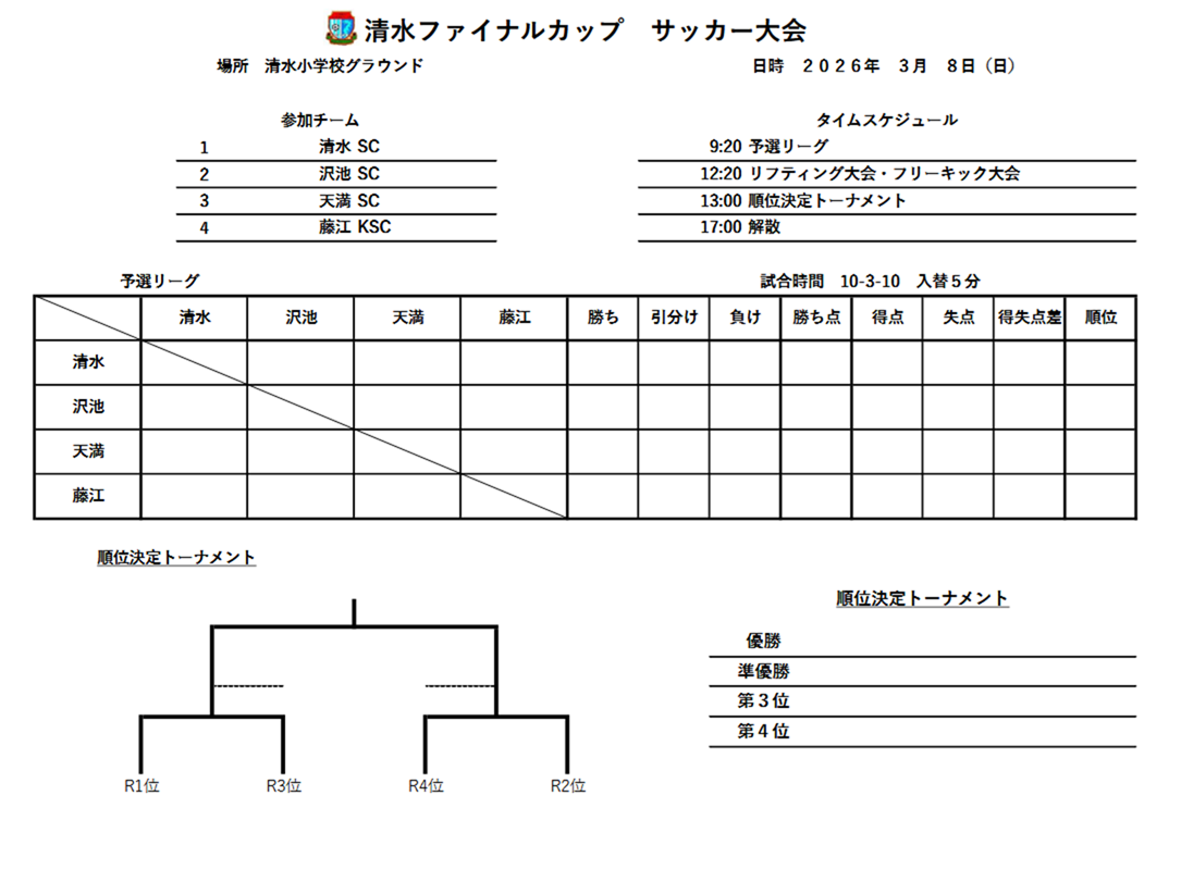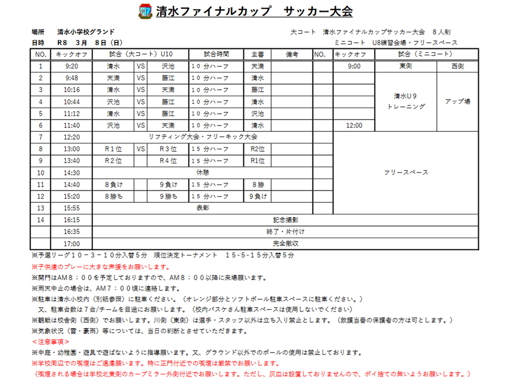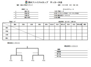 清水ファイナルカップのお知らせ(3/8(日):U12) 2026年2月28日 【日時】3月8日(日) 【場所】 清水小グラウンド 【集合時間(清水小)】 選手・協力保護者 7:50 指導者 7:20 お弁当 有り 【試合予定】 ☆要綱 ☆リーグ&トーナメント ☆タイムスケジュール 以上