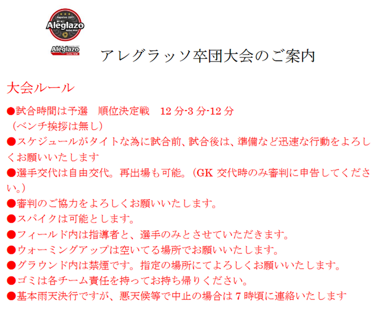 アレグラッソ卒団大会のお知らせ(3/7(土):U12)