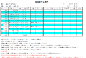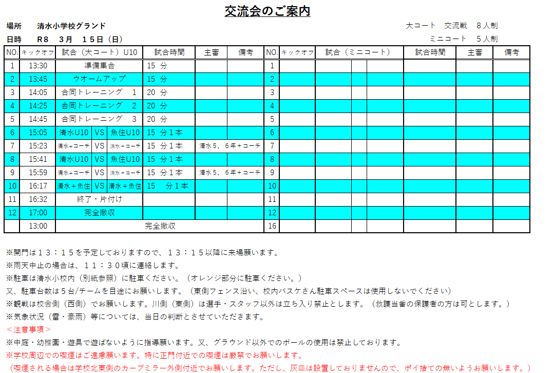 魚住UFC交流会のお知らせ(3/15(日):U12) 2026年3月12日 【日時】3月15日(日) 【場所】 清水小グラウンド 【集合時間(清水小)】 選手・指導者 13:00 【予定】 ☆駐車場 以上