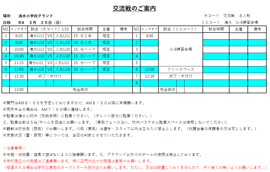 交流戦のお知らせ(3/29(日):清水U10 U11)