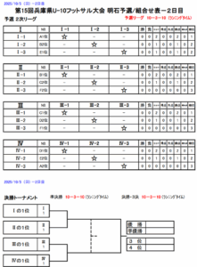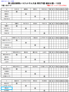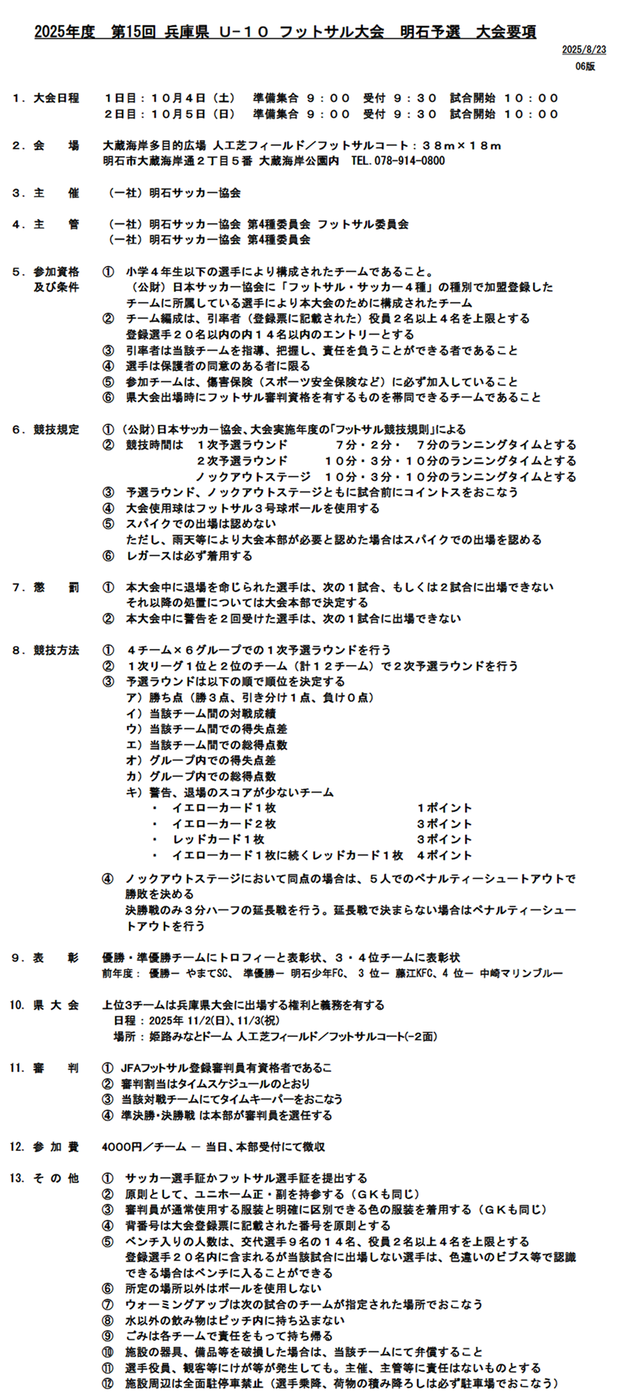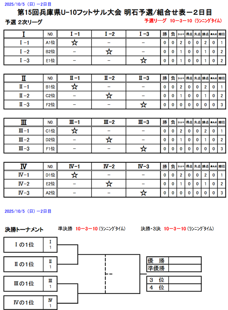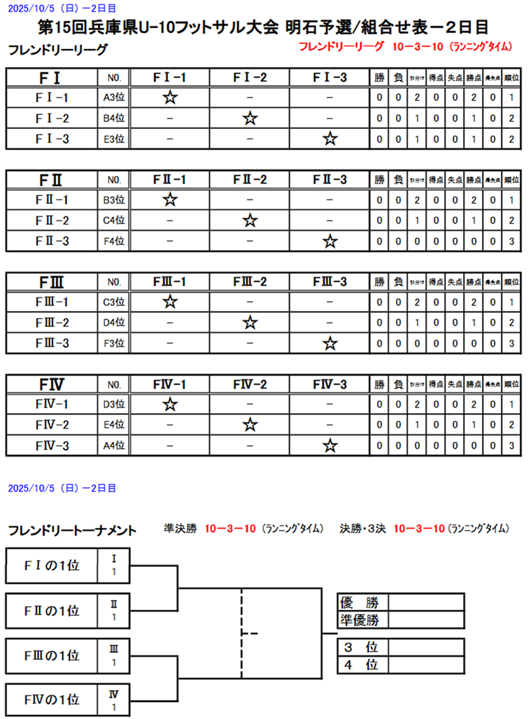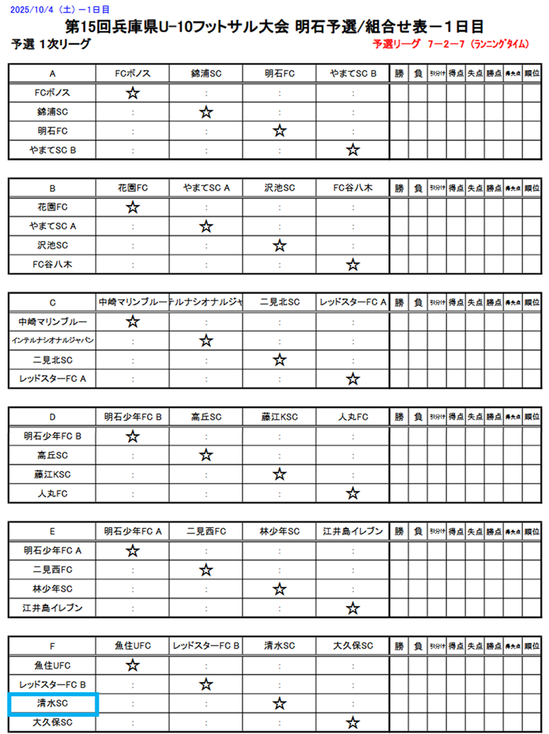 兵庫県U-10フットサル大会_明石予選(10/4((土) 5(日)) 2025年10月03日 【日時】10月4日(土) 5日(日) 【場所】大蔵海岸フットサルコート 【集合時間】 ☆4(土) 集合時間・9:30 準備集合・9:00(担当コーチお願いします) 【持ち物】試合の用意、昼食(弁当)等 注意事項・ピッチ内は水のみ。 レガースは必ず着用。 スパイク不可 ※雨天等により必要と認めた場合はスパイク可 登録表はA4プリントで当日紙で持参する。 【試合要綱】 ☆リーグ表&タイムスケジュール:4日(土) ☆リーグ表&タイムスケジュール:5日(日) 以上
